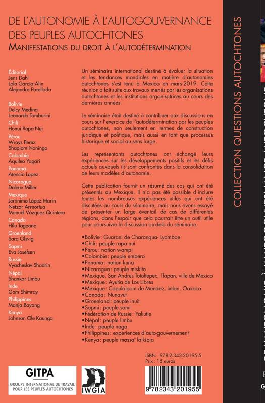 Un séminaire international destiné à évaluer la situation et les tendances mondiales en matière d'autonomies autochtones s'est tenu à Mexico en mars 2019. Il était destiné à contribuer aux discussions en cours sur l'exercice de l'autodétermination par les peuples autochtones, non seulement en termes de construction juridique et politique, mais aussi en tant que processus historique et social au sens large. Cette publication fournit la synthèse d'un large éventail de cas de différentes régions, dans l'espoir d'un outil utile pour poursuivre la discussion au-delà du colloque.