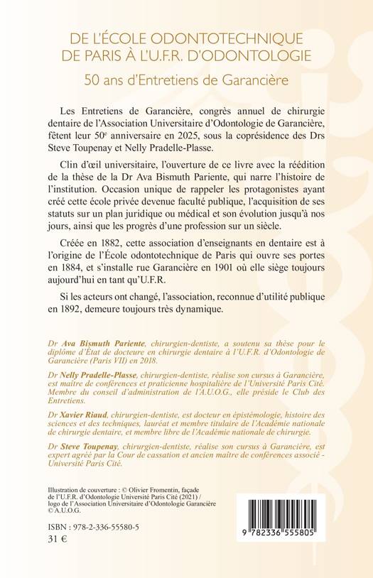 Les Entretiens de Garancière, congrès annuel de chirurgie dentaire de l'Association Universitaire d'Odontologie de Garancière, fête son 50e anniversaire en 2025, sous la coprésidence des Drs Steve Toupenay et Nelly Pradelle-Plasse. Clin d'oeil universitaire, l'ouverture de ce livre avec la réédition de la thèse de la Dr Ava Bismuth Pariente, qui narre l'histoire de l'institution. Occasion unique de rappeler les protagonistes ayant créé cette école privée devenue faculté publique, l'acquisition de ses statuts sur un plan juridique ou médical et son évolution jusqu'à nos jours, ainsi que les progrès d'une profession sur un siècle. Créée en 1882, cette association d'enseignants en dentaire est à l'origine de l'École odontotechnique de Paris qui ouvre ses portes en 1884, et s'installe rue Garancière en 1901 où elle siège toujours aujourd'hui en tant qu'U.F.R. Si les acteurs ont changé, l'association, reconnue d'utilité publique en 1892, demeure toujours très dynamique.