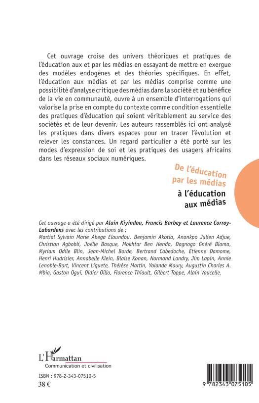 Cet ouvrage croise des univers théoriques et pratiques de l'éducation aux et par les médias en essayant de mettre en exergue des modèles endogènes et des théories spécifiques. En effet, cette éducation comprise comme une possibilité d'analyse critique des médias dans la société, ouvre à un ensemble d'interrogations qui valorise la prise en compte du contexte. Un regard particulier a été porté sur les modes d'expression de soi et les pratiques des usagers africains dans les réseaux sociaux.