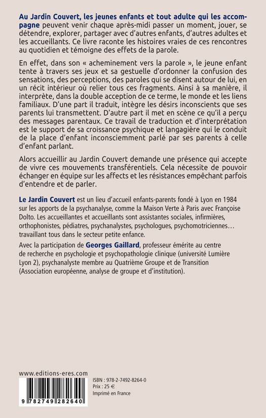 Au Jardin Couvert, les jeunes enfants et tout adulte qui les accompagne peuvent venir chaque après-midi passer un moment, jouer, se détendre, explorer, partager avec d'autres enfants, d'autres adultes et les accueillants. Ce livre raconte les histoires vraies de ces rencontres au quotidien et témoigne des effets de la parole.