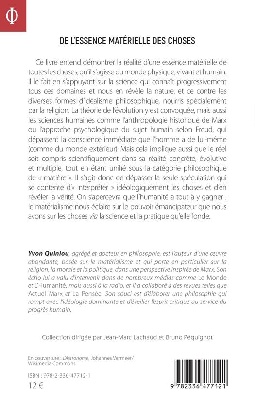 Ce livre entend démontrer la réalité d’une essence matérielle de toutes les choses, qu’il s’agisse du monde physique, vivant et humain. Il le fait en s’appuyant sur la science qui connaît progressivement tous ces domaines et nous en révèle la nature, et ce contre les diverses formes d’idéalisme philosophique, nourris spécialement par la religion. La théorie de l’évolution y est convoquée, mais aussi les sciences humaines comme l’anthropologie historique de Marx ou l’approche psychologique du sujet humain selon Freud, qui dépassent la conscience immédiate que l’homme a de lui-même (comme du monde extérieur). Mais cela implique aussi que le réel soit compris scientifiquement dans sa réalité concrète, évolutive et multiple, tout en étant unifié sous la catégorie philosophique de « matière ». Il s’agit donc de dépasser la seule spéculation qui se contente d’« interpréter » idéologiquement les choses et d’en révéler la vérité. On s’apercevra que l’humanité a tout à y gagner : le matérialisme nous éclaire sur le pouvoir émancipateur que nous avons sur les choses via la science et la pratique qu’elle fonde.