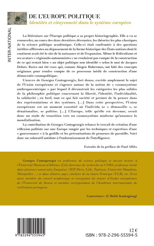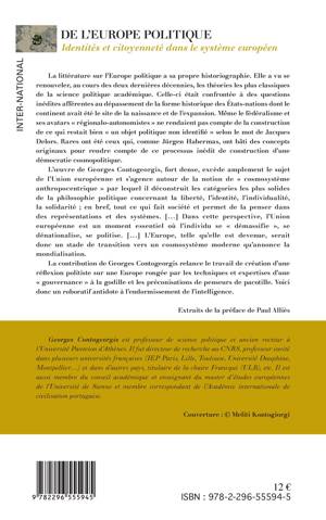 L'oeuvre de G. Contogeorgis s'agence autour de la notion de "cosmosystème anthropocentrique" par lequel il déconstruit les catégories les plus solides de la philosophie politique concernant la liberté, l'identité, l'individualité, la solidarité ; en bref, tout ce qui fait société et permet de la penser dans des représentations et des systèmes. Dans cette perspective, l'UE est un moment essentiel où l'individu se "démassifie", se dénationalise, se politise... (Extraits de la préface).