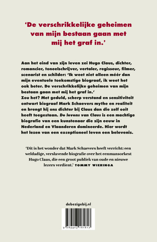 Biograaf Mark Schaevers realiseerde zich maar al te goed dat hij bij het schrijven over Hugo Claus meerdere levensverhalen had te doorgronden. Schrijver, kunstenaar, filmer: alleskunner Hugo Claus heeft er alles aan gedaan om de mythe van zijn biografie mee vorm te geven. Schaevers’ werkwijze is dezelfde als bij zijn bekroonde boek over Felix Nussbaum. Hij volgt zijn onderwerp op de voet, zonder expliciet te interpreteren. Waar de schrijver dacht: ‘ik ben de baas, hè, van al die Clausen’, geldt dat evenzeer voor de biograaf. Te midden van alle tegenstrijdigheid heeft Schaevers een leven van eenheid kunnen beschrijven, en ook voor wie Claus dacht te kennen zal het totaalbeeld verrassend zijn. De levens van Claus is het resultaat van diepgravend onderzoek, van geduld en sensitiviteit, en een getuigenis van een scherp verstand en literaire verbeelding.