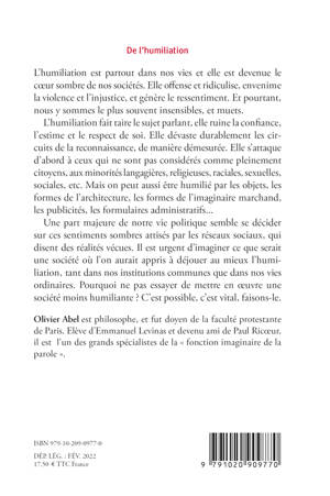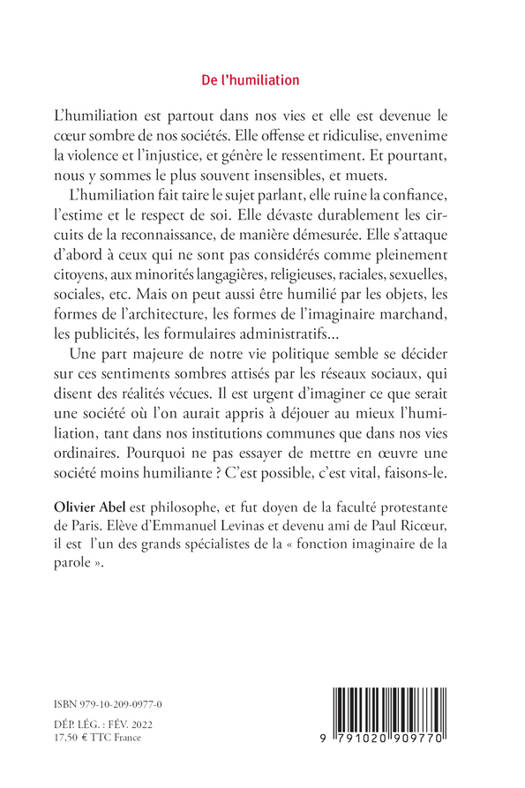 L'humiliation est partout dans nos sociétés, et nous ne la voyons pas. C'est qu'elle est difficile à mesurer, et semble subjective : ce qui humiliera l'un laissera l'autre indifférent. Elle est même souvent instrumentalisée par le machiavélisme politique, ou pire, le fanatisme religieux, quand elle n'est pas tout simplement une technique managériale. Et cela, d'autant plus que nous nous sommes enfoncés dans le déni de l'humiliation, de sa gravité, de son existence même. Nos sociétés sont sensibles aux violences et aux inégalités, mais insensibles à l'humiliation qui les empoisonne, et il nous faudrait enquêter sur les racines de cette insensibilité. Et pourtant l'humiliation est là : si les violences s'attaquent au corps de l'autre, l'humiliation s'attaque à son visage. L'humiliation fait taire le sujet parlant, elle lui fait honte de son expression, de ses croyances et de ses goûts, elle ruine sa confiance en soi, elle dévaste pour longtemps les circuits de la reconnaissance, et laisse derrière elle une parole dérisoire ou fanatique. Elle peut également atteindre des minorités langagières, sexuelles, raciales, religieuses, sociales, etc. Il arrive même qu'une majorité soit humiliée par une minorité dominante, et devienne une majorité « dangereuse ». L'humiliation du Traité de Versailles prépare la venue de Hitler au pouvoir. Beaucoup de nos sociétés jadis démocratiques sont rongées par ces manipulations de la peur et ces politiques du ressentiment, qu'attisent les « réseaux sociaux » et les médias où s'affichent librement les haines et les mépris. La barbarie pousse à nouveau aux portes de notre Histoire. C'est pourquoi il est urgent d'imaginer ce que serait une société dont les institutions (police, préfectures, administrations, prisons, hôpitaux, écoles, etc.) seraient exemplairement non-humiliantes. Dans l'état actuel de nos économies, il faudra un énorme effort pour obtenir une société plus juste, mais pourquoi ne pas essayer de mettre en oeuvre une société moins humiliante ? C'est possible et urgent, faisons-le.