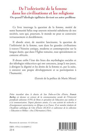 Ce livre interroge la question de la femme, moitié de notre humanité hélas trop souvent minorité subalterne de nos sociétés, sans qui, pourtant, le monde ne peut se construire vertueusement et durablement. Il aborde ainsi, de manière lancinante, la question de l'infériorité de la femme, tant dans les grandes civilisations à travers l'histoire antique, moderne et contemporaine sur la longue durée, que dans l'Église romaine, tout spécialement en contexte africain. Il dresse enfin l'état des lieux des mythologies sociales et des idéologies réductrices qui ont concouru, jusqu'à nos jours, à dénigrer la dignité et les droits de la femme et, par la suite, à entraver son propre développement et sa participation à l'humanité. (Extrait de la préface de Marie Miran)