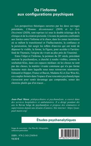 Les perspectives théoriques ouvertes par les deux ouvrages précédents, L’Homme décontenancé (2019) et Le Soi- Disséminé (2020), sont reprises ici sous le double éclairage de la clinique et de la création picturale. L’écoute de patients confrontés aux limites entre l’informe et le chaos, dans les zones incertaines où se mêlent le transitionnel et l’hallucinatoire, la confiance et la persécution, fait surgir les reflets d’oeuvres qui ont tenté de dépasser le visible, la forme, la Figure, pour accéder à l’arrière-fond de l’humain, l’origine du vivant au plus près de l’inanimé. Entre l’objet et l’informe, la peinture du 20e siècle, précédant souvent la psychanalyse, a cherché à rendre visibles, dans ces espaces médiaux où les choses ne sont pas des choses, la matière vivante commune qui n’a pas forme humaine mais dans laquelle nous nous retrouvons néanmoins.
