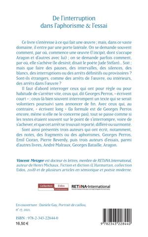 Cet ouvrage s’intéresse à ce qui fait une oeuvre Mais dans ce vaste domaine, il entre par une porte latérale. On se demande souvent comment, par où commence une oeuvre, ou bien comment et par où elle s’achève. Mais que faire des pauses, intervalles, silences, blancs, interruptions ou des arrêts définitifs ou provisoires ? Sont-ils étrangers, comme des arrêts de l’oeuvre, ou intérieurs, des arrêts dans l’oeuvre ? Il faut d’abord interroger ceux qui ont pour règle ou pour habitude de s’arrêter vite, ceux qui, dit Georges Perros, "écrivent court" ; ceux-là bien souvent interrompent un texte qui se serait volontiers poursuivi sans annoncer de fin. Avec ceux qui, au contraire, "écrivent long", tout se passe comme si les textes étaient souvent sur le point de s’interrompre, et que l'arrêt se trouvait reporté. Sont ainsi présentés des auteurs qui ont écrit, notamment, des notes, des fragments ou des aphorismes, Perros, Cioran, Reverdy, puis trois auteurs d’essais, Malraux, Bataille, Aragon.