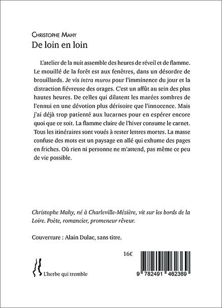 En de courtes proses poétiques, Christophe Mahy parle de son rapport à l’écriture, de ses sources d’inspiration. « L’atmosphère du recueil », dit-il, « ;traduit une sorte de mouvement intérieur, traversé de transparences, de verdure, d’herbes, de rivières et de chemins, de lisières ». Grand marcheur le jour, le poète écrit la nuit, sa table d’écriture près d’une fenêtre.