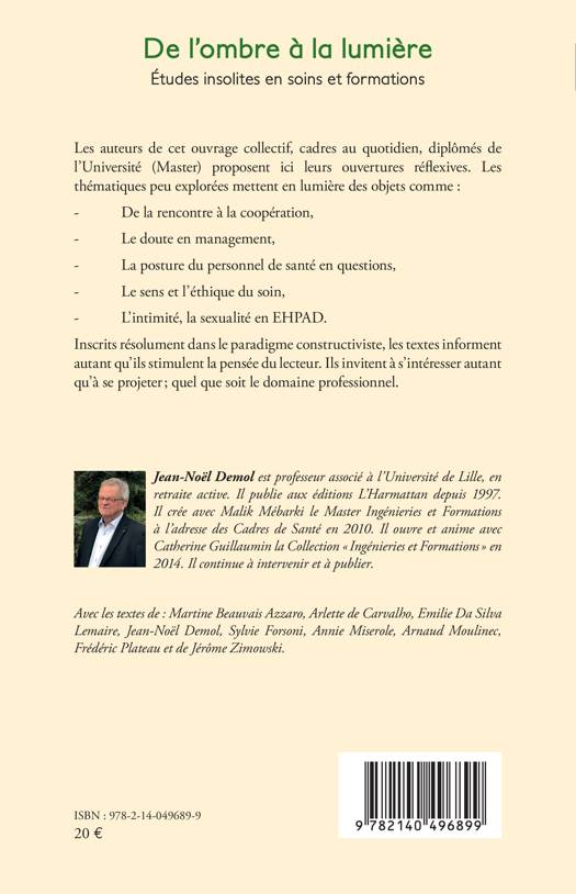 Les auteurs de cet ouvrage collectif, cadres au quotidien, diplômés de l'Université (Master) proposent ici leurs ouvertures réflexives. Les thématiques peu explorées mettent en lumière des objets comme: - De la rencontre à la coopération, - Le doute en management, - La posture du personnel de santé en questions, - Le sens et l'éthique du soin, - L'intimité, la sexualité en EHPAD. Inscrits résolument dans le paradigme constructiviste, les textes informent autant qu'ils stimulent la pensée du lecteur. Ils invitent à s'intéresser autant qu'à se projeter; quel que soit le domaine professionnel.