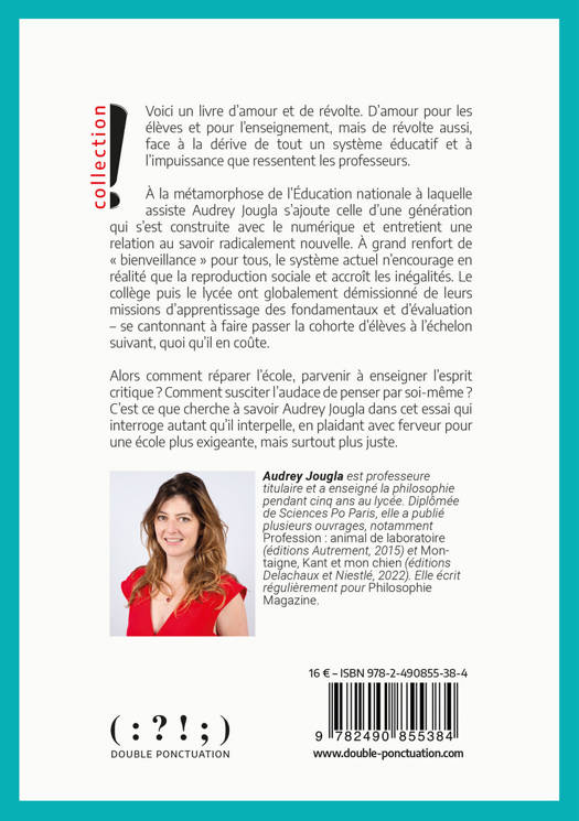 Voici un livre d'amour et de révolte. D'amour pour les élèves et pour l’enseignement mais de révolte aussi, face à la dérive de tout un système éducatif et à l'impuissance que ressentent les professeurs. À la métamorphose de l’Éducation nationale à laquelle assiste Audrey Jougla, s’ajoute celle d’une génération qui s’est construite avec le numérique et entretient une relation au savoir radicalement différente. Le rapport à l’image, au langage, à l’écrit ou à l’information sont bouleversés. À grands renforts de « bienveillance » pour tous et de tolérance, le système actuel n'encourage en réalité que la reproduction sociale. La maîtrise de la langue, le goût pour l’effort ou la culture, deviennent l'apanage des élèves qui ont la chance de pouvoir les apprendre dans leurs familles. Si le diagnostic s'avère forcément complexe, le collège puis le lycée ont globalement démissionné de leurs missions d'apprentissage des fondamentaux, de notation claire, d'évaluation, et se cantonnent à faire passer la cohorte d'élèves à l'échelon suivant, quoi qu'il en coûte. Les élèves comme leurs familles sont victimes d’une « crise de l’éducation » profonde, pour reprendre les mots d’Hannah Arendt. Comment réparer l'école, parvenir à enseigner l’esprit critique ? Comment susciter l'autonomie et l'audace de penser par soi-même ? C’est ce que cherche à savoir Audrey Jougla dans cet essai qui interroge autant qu’il interpelle, en plaidant avec ferveur pour une école plus exigeante mais surtout plus juste.