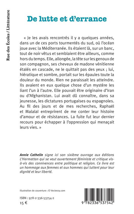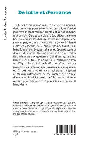 Je les avais rencontrés il y a quelques années, dans un de ces ports tourmentés du sud, où l'océan joue avec la Méditerranée. Ils étaient là, sur un banc, tout de noir vêtus et semblaient être ailleurs, comme hors du temps. Elle, allongée, la tête sur les genoux de son compagnon, ses cheveux de madone vénitienne étalés en cascade, ne le quittait pas des yeux; lui, hiératique et sombre, portait sur les épaules toute la douleur du monde. Rien ne paraissait les atteindre. Ils avaient en eux quelque chose d'un mystère les liant l'un à l'autre. Elle pouvait être originaire d'Iran ou d'Afghanistan. Lui avait dû connaître, dans sa jeunesse, les dictatures portugaises ou espagnoles. Au fil des jours et de mes recherches, Raphaël et Malalaï entreprirent de me conter leur histoire d'amour et de résistances. La fuite fut leur dernier recours pour échapper à l'oppression qui menaçait leurs vies.