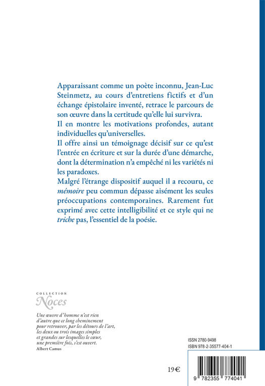 Un tel livre ne peut exister que s'il est écrit durant le deuxième versant d'une vie ; mais son propos est d'une actualité qui prétend ne pas vieillir. Il s'agit, en effet, de montrer les commencements d'une écriture et la construction d'une œuvre, même ignorée. Loin de verser dans la théorie, De mémoire dévoile les tout débuts du geste d’écrire ; il montre les motivations, l'expérience, la découverte progressive de la prose, puis de la poésie, depuis l'enfance jusqu'à la maturité. Ce sont de tels points de départ et repères qui importent ; ils n'ont été que rarement dits par les écrivains. Jean-Luc Steinmetz nous place dans son écriture, en tant qu'elle s'est faite, pensée et qu'elle a construit pendant cinquante années une œuvre rimant avec le monde.