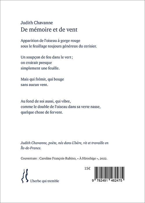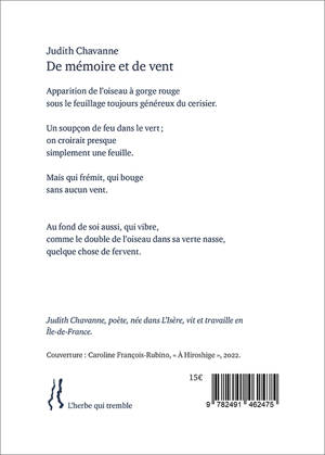 Les poèmes de De mémoire et de vent disent une transition douloureuse, mais ont a cœur d’aller vers une ouverture. D’un versant à l’autre les mots y cheminent, passant d’une note mélancolique à une note romantique. Au gré du regard à travers une fenêtre, le jardin est le plus constant interlocuteur de la poète.