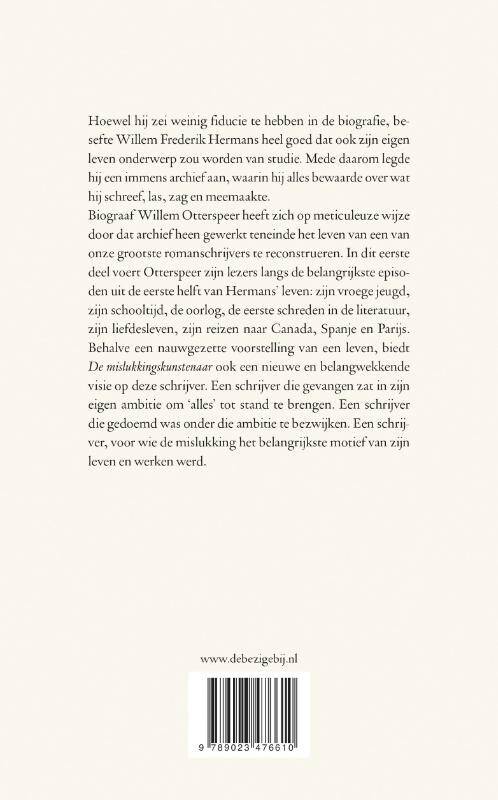 Hoewel hij zei weinig fiducie te hebben in de biografie, besefte Willem Frederik Hermans heel goed dat ook zijn eigen leven onderwerp zou worden van studie. Mede daarom legde hij een immens archief aan, waarin hij alles bewaarde over wat hij schreef, las, zag en meemaakte. Biograaf Willem Otterspeer heeft zich op meticuleuze wijze door dat archief heen gewerkt teneinde het leven van een van onze grootste romanschrijvers te reconstrueren. In dit eerste deel voert Otterspeer zijn lezers langs de belangrijkste episoden uit de eerste helft van Hermans leven: zijn vroege jeugd, zijn schooltijd, de oorlog, de eerste schreden in de literatuur, zijn liefdesleven, zijn reizen naar Canada, Spanje en Parijs. Behalve een nauwgezette voorstelling van een leven, biedt De mislukkingskunstenaar ook een nieuwe en belangwekkende visie op deze schrijver. Een schrijver die gevangen zat in zijn eigen ambitie om `alles tot stand te brengen. Een schrijver die gedoemd was onder die ambitie te bezwijken. Een schrijver, voor wie de mislukking het belangrijkste motief van zijn leven en werken werd.