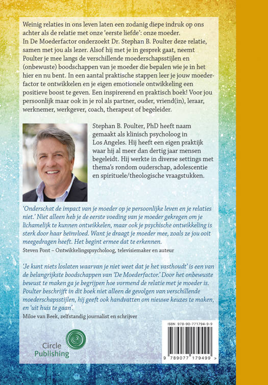 Weinig relaties in ons leven laten een zodanig diepe indruk op ons achter als de relatie met onze 'eerste liefde': onze moeder. In De Moederfactor onderzoekt Dr. Stephan B. Poulter deze relatie, samen met jou als lezer. Alsof hij met je in gesprek gaat, neemt Poulter je mee langs de verschillende moederschapsstijlen en (onbewuste) boodschappen van je moeder die bepalen wie je in het hier en nu bent. In een aantal praktische stappen leer je jouw moederfactor te ontwikkelen en je eigen emotionele ontwikkeling een positieve boost te geven. Een inspirerend en praktisch boek! Voor jou persoonlijk maar ook in je rol als partner, ouder, vriend(in), leraar, werknemer, werkgever, coach, therapeut of begeleider.