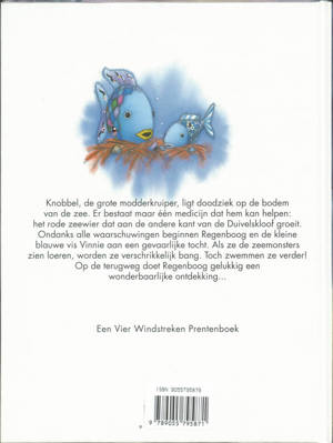 Knobbel, de modderkruiper is ziek. Alleen het rode zeewier dat aan het einde van de duivelskloof groeit, kan hem genezen. Maar over deze plek doen de ergste verhalen de ronde: daar wonen een driekoppige koraaldraak, een groen zeemonster met wel duizend armen en de zwarte, vijfogige kogelvis. De Duivelskloof is de gevaarlijkste plek van de zee. Moedig gaan Regenboog en Vinnie, de kleine blauwe vis op pad. Ze overwinnen hun angst en ontdekken dat ze zich de monsters zelf ingebeeld hebben. Nu kan Knobbel genezen worden.