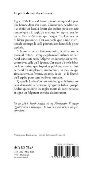 Si le roman relate l'interrogatoire, la détention, le procès d'Iveton, il évoque également l'enfance de Fernand dans son pays, l'Algérie, et s'attarde sur sa rencontre avec celle qu'il épousa. Car avant d'être le héros ou le terroriste que l'opinion publique verra en lui, Fernand fut simplement un homme, un idéaliste qui aima sa terre, sa femme, ses amis, la vie - et la liberté, qu'il espéra pour tous les frères humains.