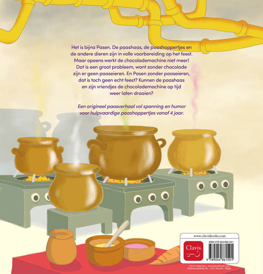 Het is bijna Pasen. De paashaas, de paashoppertjes en de andere dieren zijn in volle voorbereiding op het feest. Maar opeens werkt de chocolademachine niet meer! Dat is een groot probleem, want zonder chocolade zijn er geen paaseieren. En Pasen zonder paaseieren, dat is toch geen echt feest? Kunnen de paashaas en zijn vriendjes de chocolademachine op tijd weer laten draaien?