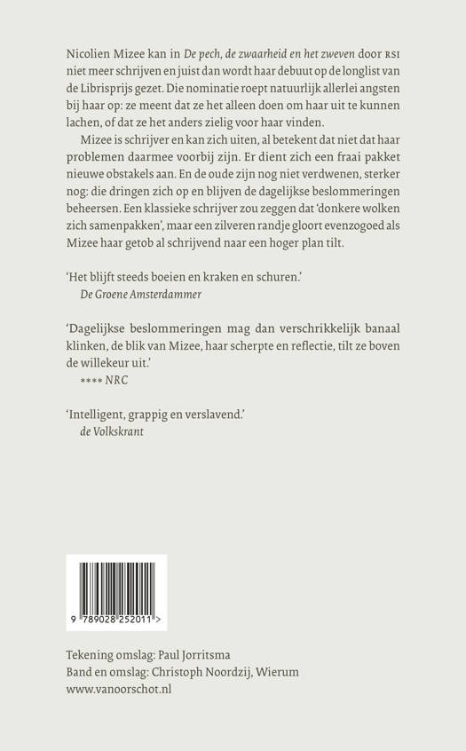 Nicolien Mizee kan in De pech, de zwaarheid en het zweven door rsi niet meer schrijven en juist dan wordt haar debuut op de longlist van de Librisprijs gezet. Die nominatie roept natuurlijk allerlei angsten bij haar op: ze meent dat ze het alleen doen om haar uit te kunnen lachen, of dat ze het anders zielig voor haar vinden. Mizee is schrijver en kan zich uiten, al betekent dat niet dat haar problemen daarmee voorbij zijn. Er dient zich een fraai pakket nieuwe obstakels aan. En de oude zijn nog niet verdwenen, sterker nog: die dringen zich op en blijven de dagelijkse beslommeringen