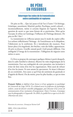 De père en fils... Que (se) passe-t-il de l'un à l'autre ? Un héritage. Génétique, assurément. Matériel, parfois. Psychique, social, culturel... incontestablement, même si certains feignent de l'ignorer. Reste la question de savoir ce que nous faisons de ce patrimoine. Mais qu'on l'accepte, le refuse ou l'aménage, l'influence de l'héritage demeure. De père en fils ? Sûr ! La transmission ne s'effectue jamais sous le mode du copier-coller. Les enfants infléchissent l'héritage: ils l'enrichissent ou le dilapident, l'édulcorent ou le confortent. Ils y introduisent des nuances. Pour laisser place à la singularité, des brèches, voire des failles, apparaissent. De père en fissures. L'oreille entend pareil. L'oeil perçoit différent. Une ambiguïté à l'image de la transmission: l'obligation de négocier entre même et autre. Ce livre se propose de convoquer quelques thèmes à partir desquels, dans le cadre familial et alentour, illustrer les voies énigmatiques de la transmission. Face aux ambiguïtés de cette passation, une invitation à éviter de faire mine d'en être les organisateurs. Mais aussi de refuser d'en être les jouets. Et tout autant les spectateurs. Se situer à distance de ces extrémités. Avec juste ce qu'il faut de sentiment de gratitude et d'appétit de liberté. Ou du moins, pour les plus lucides, ce qui en tient lieu.
