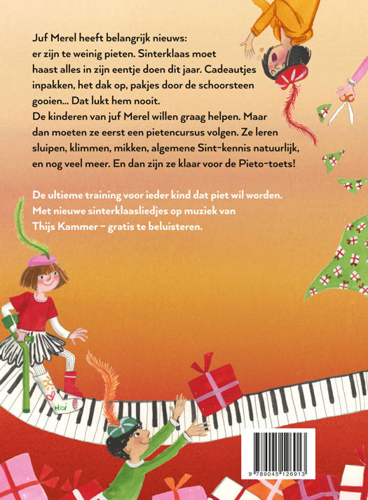 Juf Merel heeft slecht nieuws. Er is een pietentekort, en daardoor komt het sinterklaasfeest in gevaar. Willen de kinderen helpen het probleem op te lossen? Dat willen Emma, Salim, Dolores, Linde en alle anderen wel. Ze moeten eerst een pieten-cursus volgen. Alles wat een piet moet kunnen komt aan bod: pepernoten gooien, liedjes zingen, evenwichtsoefeningen (om op daken te kunnen lopen), cadeautjes inpakken...