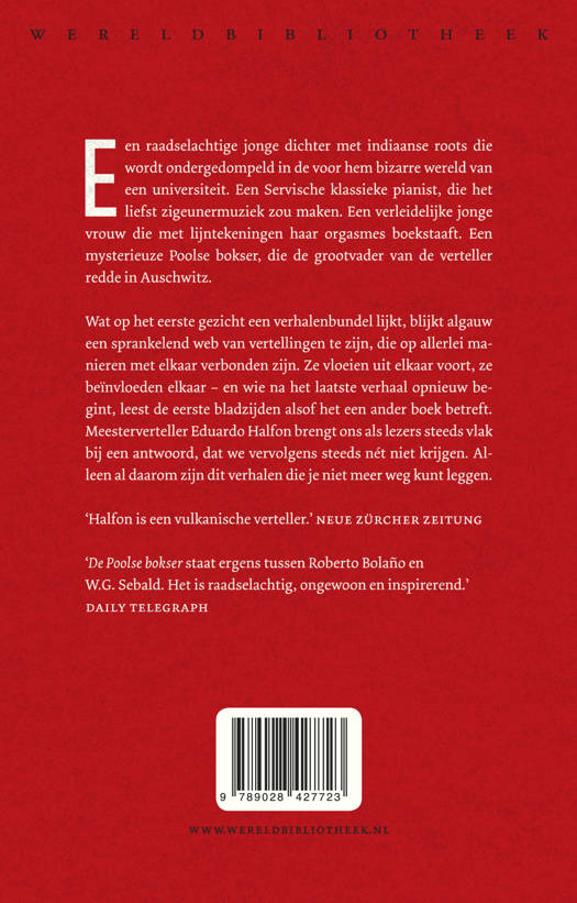 Een ongrijpbare meesterverteller aan het woordMet verhalen die steeds meer samenhang blijken te vertonen, roept Eduardo Halfon een wereld op die zich laat lezen als een hecht opgebouwde roman. Ieder nieuw verhaal is op een verrassende manier verbonden met de andere verhalen en zet alles in een ander licht. Een joodse grootvader vertelt aan zijn kleinzoon hoe hij Auschwitz overleefde dankzij een Poolse bokser. Die had hem verteld welke woorden hij bij een verhoor door een SS'er wel en welke hij niet moest gebruiken. Maar welke woorden waren dat? We komen er als lezer vlakbij, maar het antwoord krijgen we nét niet. Waarom verschijnt die ene getalenteerde literatuurstudent, die intrigerende gedichten schrijft, van de ene op de andere dag niet meer op de universiteit? Docent Eduardo Halfon gaat tevergeefs naar hem op zoek. En waar blijft de Servische jazzpianist die in de straten van Belgrado op zoek is naar zijn zigeunerroots? Hoe zit het eigenlijk met ons geheugen – kun je de werkelijkheid wel beschrijven? LA Times: 'Halfon vervaagt bewust de grenzen tussen roman, memoires en overpeinzingen. De kracht van De Poolse bokser is, dat het steeds is geworteld in het persoonlijke. Het is heel toegankelijk en zeer ontroerend.' The New York Times: 'De Poolse bokser heeft misschien wel nooit bestaan. En toch vermindert dit op geen enkele wijze het plezier dat Halfons verhalen bieden.' El País: 'Met zijn ingetogen en nauwkeurige proza verkruimelt Halfon onbetreden werelden en onthult hij het onbekende.' Le Figaro: 'Een ongelooflijk goede schrijver, die Halfon, zijn woorden zijn droog als kiezelstenen.' Daily Telegraph: 'De Poolse bokser staat ergens tussen Roberto Bolaño en W.G. Sebald. Het is raadselachtig, ongewoon en inspirerend.'