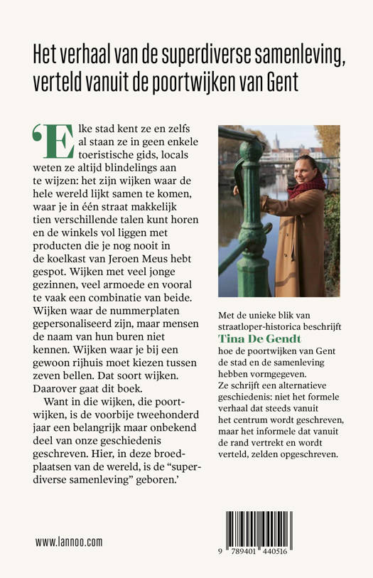 Wie kan zich nog een stad voorstellen zonder superdiverse wijken aan de rand? Meer dan 150 nationaliteiten, minderheden in de meerderheid, een constant komen en gaan: het is al lang geen uitzondering meer, ook niet in Gent. Hoe komt dat? En waarom precies in die wijken? Historica Tina De Gendt dook in het verleden van haar thuisstad en vond de kiem van de superdiverse samenleving in wat zij de 'poortwijken' noemt. Deze wijken, gelegen waar tot 1860 de monumentale stadspoorten stonden, fungeren vandaag de dag als knooppunten die de stad met de wereld verbinden, net zoals poorten dat eeuwenlang deden. Hoe groeiden die de afgelopen eeuw uit tot aankomstzones, wachtkamers en opstapplaatsen? Waarom ontstonden daar de grote sociale vernieuwingen, van arbeidersbewegingen tot zelforganiserende buurthuizen en gevrijwaarde publieke ruimte? En zijn deze plaatsen, waar aangename en minder aangename botsingen voorkomen, nu ten dode opgeschreven? Met de unieke blik van straatloper-historica beschrijft Tina De Gendt hoe de poortwijken van Gent de stad en de samenleving hebben vormgegeven. Ze schrijft een alternatieve geschiedenis: niet het formele verhaal dat steeds vanuit het centrum wordt geschreven, maar het informele dat vanuit de rand vertrekt en wordt verteld, zelden opgeschreven 'Elke stad kent ze en zelfs al staan ze in geen enkele toeristische gids, locals weten ze altijd blindelings aan te wijzen: het zijn wijken waar de hele wereld lijkt samen te komen, waar je in één straat makkelijk tien verschillende talen kunt horen en de winkels vol liggen met producten die je nog nooit in de koelkast van Jeroen Meus hebt gespot. Wijken met veel jonge gezinnen, veel armoede en vooral te vaak een combinatie van beide. Wijken waar de nummerplaten gepersonaliseerd zijn, maar mensen de naam van hun buren niet kennen. Wijken waar je bij een gewoon rijhuis moet kiezen tussen zeven bellen. Dat soort wijken. Daarover gaat dit boek. Want in die wijken, die poortwijken, is de voorbije tweehonderd jaar een belangrijk maar onbekend deel van onze geschiedenis geschreven. Hier, in deze broedplaatsen van de wereld, is de "superdiverse samenleving" geboren.'