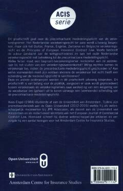Dit proefschrift gaat over de precontractuele mededelingsplicht van de verzekeringnemer. Het Nederlandse verzekeringsrecht ter zake wordt uitvoerig besproken, maar ook het Duitse, Franse, Engelse, Zwitserse en Belgische verzekeringsrecht en de Principles of European Insurance Contract Law. Voorts besteedt de auteur aandacht aan de wetsgeschiedenis en aan het oude Nederlandse verzekeringsrecht met betrekking tot de precontractuele mededelingsplicht. Welke feiten moet een (aspirant-)verzekeringnemer mededelen aan de verzekeraar bij het sluiten van een verzekeringsovereenkomst? Welke rechten komen de verzekeraar toe, indien de precontractuele mededelingsplicht geschonden is? Aan welke voorwaarden moet zijn voldaan alvorens de verzekeraar het recht heeft een schending van de mededelingsplicht te sanctioneren? Deze en andere onderwerpen worden in dit proefschrift uitvoerig besproken. Dit proefschrift is van belang voor de praktijk, aangezien er vaak wordt geprocedeerd tussen verzekeraars en verzekeringnemers naar aanleiding van een weigering van de verzekeraar om (geheel) uit te keren vanwege een (vermeende) schending van de precontractuele mededelingsplicht.