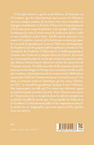 L'Europe latine n'a guere su de Rhazes, d'Avicenne ou d'Averroes, que des elucubrations qui avaient ete elaborees sur leur compte comme de les faire vivre tous ensemble en Espagne musulmane et de faire d'Averroes l'empoisonneur d'Avicenne pour cause de jalousie. Cela marque la difference fondamentale entre le mouvement de traduction greco-arabe et son corollaire arabo-latin. Tandis que le premier s'est soucie de traduire, a partir de la litterature savante grecque, des recueils biographiques (comme l'Histoire philosophique de Porphyre), des biographies philosophiques (comme la Vita Aristotelis de Ptolemee d'Alexandrie) et bibliographiques (comme Sur l'ordre de ses propres livres de Galien), le second ne s'est pas preoccupe de savoir qui etaient les auteurs arabes qui allaient devenir pour plusieurs siecles les autorites de l'Europe savante. Il a fallu attendre la Renaissance italienne pour que se developpe en Europe une conscience intellectuelle qui conduise a la production de la monumentale Bibliotheca universalis (1545) de l'humaniste suisse Conrad Gessner. C'est dans ce nouveau contexte historique qu'est concu a Rome, en 1527, le recueil biographique de Jean-Leon l'Africain. Son importance est telle qu'il va rester une reference quasi incontestee jusqu'au milieu du XIXe siecle. Pour se convaincre de l'importance de sa reception dans la culture europeenne moderne, il suffit de savoir que l'Encyclopedie de Diderot et d'Alembert l'a litteralement pille en lui empruntant plus de la moitie de ses biographies qui sont reprises telles quelles dans ses entrees.