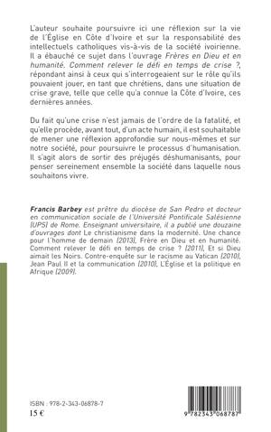 L'auteur souhaite poursuivre ici une réflexion sur la vie de l'Église en Côte d'Ivoire et sur la responsabilité des intellectuels catholiques vis-à-vis de la société ivoirienne. Il s'agit de sortir des préjugés déshumanisants, pour penser sereinement ensemble la société dans laquelle nous souhaitons vivre.