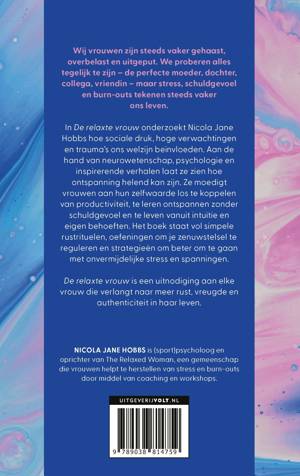 In De relaxte vrouw onderzoekt Nicola Jane Hobbs hoe stress door sociale druk, onrealistische verwachtingen en traumatische ervaringen van invloed is op onze geest, ons lichaam en onze relaties. Nicola combineert neurowetenschap en psychologie aan de hand van inspirerende verhalen van vrouwen die de herstellende kracht van relaxen hebben ontdekt. Ze laat zien hoe je een relaxte vrouw kunt worden: een vrouw die haar gevoel van eigenwaarde heeft losgekoppeld van haar productiviteit, die zonder schuldgevoel en onrust kan ontspannen, die haar intuïtie vertrouwt, gehoor geeft aan haar behoeften en naar haar eigen overtuigingen leeft.