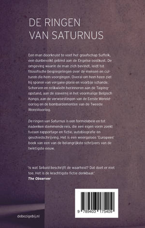 De ringen van Saturnus is een formidabele en tot nadenken stemmende reis, die een eigen vorm zoekt tussen rapportage en fictie, autobiografie en geschiedschrijving. Het is een weergaloos ‘Europees’ boek van een van de belangrijkste schrijvers van de twintigste eeuw.