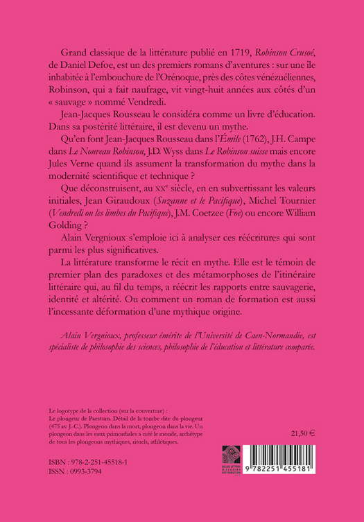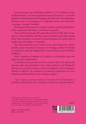Grand classique de la litterature publie en 1719, Robinson Crusoe, de Daniel Defoe, est un des premiers romans d'aventures: sur une ile inhabitee a l'embouchure de l'Orenoque, pres des cotes venezueliennes, Robinson, qui a fait naufrage, vit vingt-huit annees aux cotes d'un sauvage nomme Vendredi. Jean-Jacques Rousseau le considera comme un livre d'education. Dans sa posterite litteraire, il est devenu un mythe. Qu'en font Jean-Jacques Rousseau dans l'Emile (1762), J.H. Campe dans Le Nouveau Robinson, J.D. Wyss dans Le Robinson suisse mais encore Jules Verne quand ils assument la transformation du mythe dans la modernite scientifique et technique ? Que deconstruisent, au XXe siecle, en en subvertissant les valeurs initiales, Jean Giraudoux (Suzanne et le Pacifique), Michel Tournier (Vendredi ou les limbes du Pacifique), J.M. Coetzee (Foe) ou encore William Golding ? Alain Vergnioux s'emploie ici a analyser ces reecritures qui sont parmi les plus significatives. La litterature transforme le recit en mythe. Elle est le temoin de premier plan des paradoxes et des metamorphoses de l'itineraire litteraire qui, au fil du temps, a reecrit les rapports entre sauvagerie, identite et alterite. Ou comment un roman de formation est aussi l'incessante deformation d'une mythique origine.