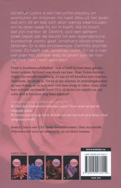 De miljonairsclub is een geheim genootschap van zes ongelooflijk knappe, rijke mannen - maar in de liefde zijn ze minder succesvol Jonathan Lyons is een beruchte playboy en avonturier, en miljonair. Hij haalt alles uit het leven wat erin zit en laat zich door weinig weerhouden om te doen waar hij zin in heeft. Als hij hoort dat zijn mentor, dr. DeWitt, ooit een geheim boek bezat dat de sleutel tot een legendarische kunstschat vormt, gaat Jonathans bloed sneller stromen. Er is één probleempje: DeWitts dochter Violet. Zij heeft wat Jonathan zoekt. En ze is niet van plan het zomaar weg te geven aan de man die haar hart heeft gebroken. Violet is Jonathans achilleshiel - ook al heeft hij haar jaren geleden bruut verlaten, hij houdt nog steeds van haar. Maar Violets herinneringen zijn minder rooskleurig. Ze kan en wil Jonathan niet vergeven. Tenminste, dat denkt ze. Tot hij al zijn charmes en verleidingskunsten op haar loslaat, en ze toch weer voor hem dreigt te vallen. Maar is het hem wel echt om haar te doen? Of is zij slechts het middel om zijn echte doel te bereiken: nog meer rijkdom?
