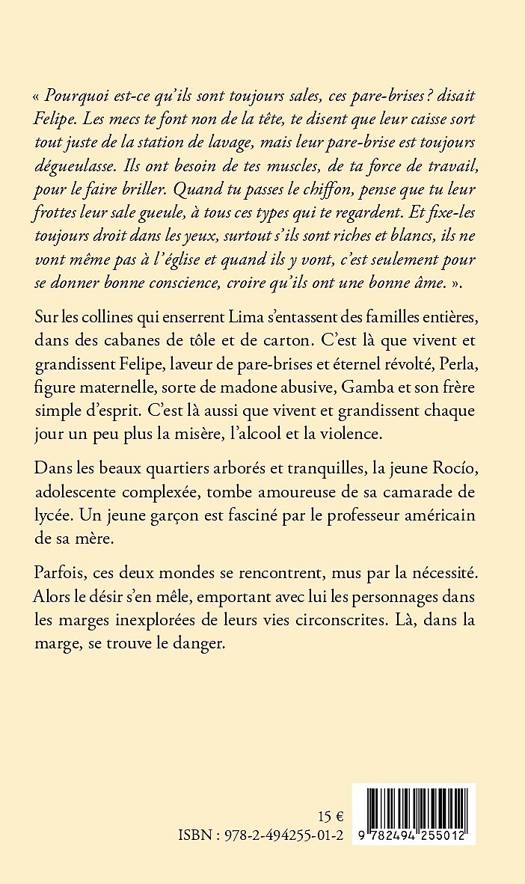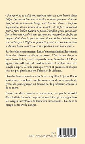 Sur les collines qui enserrent Lima s’entassent des familles entières, dans des cabanes de tôle et de carton. C’est là que vivent et grandissent Felipe, laveur de pare-brises et éternel révolté, Perla, figure maternelle, sorte de madone abusive, Gamba et son frère simple d’esprit. C’est là aussi que vivent et grandissent chaque jour un peu plus la misère, l’alcool et la violence. Dans les beaux quartiers arborés et tranquilles, la jeune Rocío, adolescente complexée, tombe amoureuse de sa camarade de lycée. Un jeune garçon est fasciné par le professeur américain de sa mère. Parfois, ces deux mondes se rencontrent, mus par la nécessité. Alors le désir s’en mêle, emportant avec lui les personnages dans les marges inexplorées de leurs vies circonscrites. Là, dans la marge, se trouve le danger.
