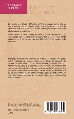 En Russie, la révolution d’Octobre en 1917 et la guerre civile jettent, parmi tant d’autres, toute une famille de Saratov sur les chemins de l’exil vers Berlin, puis Paris, et qui se prolongent jusqu’à nos jours après quatre générations. Cette chronique d’exil raconte le destin souvent tragique vécu par les Russes blancs, émigration marquée tant par les évènements politiques et l’histoire que par les difficultés et les douleurs du quotidien.