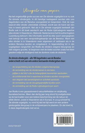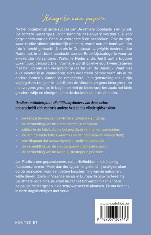 Na het ongelooflijk grote succes van De slimste vogelgids (Zomereditie, Wintereditie en Junioreditie) is er nu ook De slimste vlindergids. In dit handige naslagwerk worden alle 100 dagvlinders van de Benelux voorgesteld en besproken. Ook de rups waaruit elke vlinder ontpopt wordt aan de hand van een foto in beeld gebracht. Net als in De slimste vogelgids besteedt Jan Rodts ook in dit boek aandacht aan de Rode-Lijstcategorie waartoe elke vlinder in Vlaanderen, Wallonië, Nederland en het Groothertogdom Luxemburg behoort.