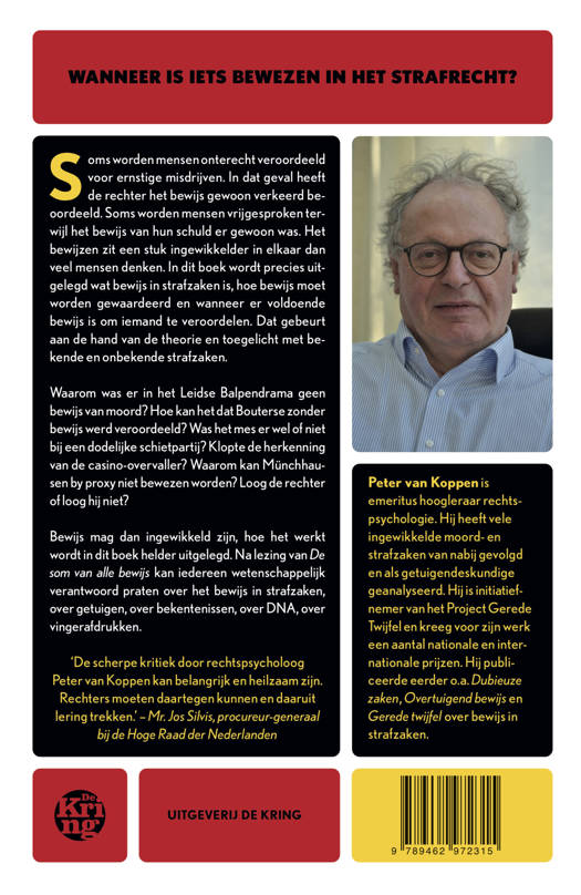 Wanneer is iets bewezen in het strafrecht? ***** Soms worden mensen onterecht veroordeeld voor ernstige misdrijven. In dat geval heeft de rechter het bewijs gewoon verkeerd beoordeeld. Soms worden mensen vrijgesproken terwijl het bewijs van hun schuld er gewoon was. Het bewijzen zit een stuk ingewikkelder in elkaar dan veel mensen denken. In dit boek wordt precies uitgelegd wat bewijs in strafzaken is, hoe bewijs moet worden gewaardeerd en wanneer er voldoende bewijs is om iemand te veroordelen. Dat gebeurt aan de hand van de theorie en toegelicht met bekende en onbekende strafzaken. Waarom was er in het Leidse Balpendrama geen bewijs van moord? Hoe kan het dat Bouterse zonder bewijs werd veroordeeld? Was het mes er wel of niet bij een dodelijke schietpartij? Klopte de herkenning van de casino-overvaller? Waarom kan Münchhausen by proxy niet bewezen worden? Loog de rechter of loog hij niet? Bewijs mag dan ingewikkeld zijn, hoe het werkt wordt in dit boek helder uitgelegd. Na lezing van DE SOM VAN ALLE BEWIJS kan iedereen wetenschappelijk verantwoord praten over het bewijs in strafzaken, over getuigen, over bekentenissen, over DNA, over vingerafdrukken.