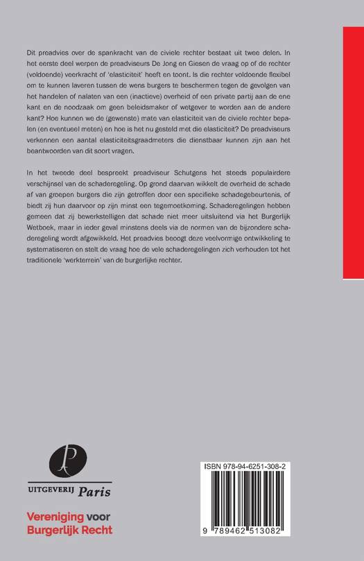 Dit preadvies over de spankracht van de civiele rechter bestaat uit twee delen. In het eerste deel werpen de preadviseurs De Jong en Giesen de vraag op of de rechter (voldoende) veerkracht of ‘elasticiteit’ heeft en toont. Is die rechter voldoende flexibel om te kunnen laveren tussen de wens burgers te beschermen tegen de gevolgen van het handelen of nalaten van een (inactieve) overheid of een private partij aan de ene kant en de noodzaak om geen beleidsmaker of wetgever te worden aan de andere kant? Hoe kunnen we de (gewenste) mate van elasticiteit van de civiele rechter bepalen (en eventueel meten) en hoe is het nu gesteld met die elasticiteit? De preadviseurs verkennen een aantal elasticiteitsgraadmeters die dienstbaar kunnen zijn aan het beantwoorden van dit soort vragen.