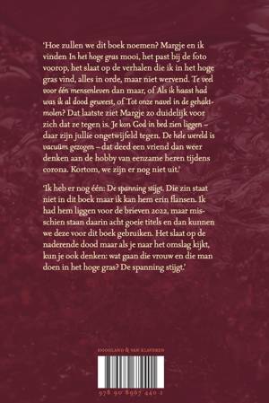 ‘Ik heb er nog één: De spanning stijgt. Die zin staat niet in dit boek maar ik kan hem erin flansen. Ik had hem liggen voor de brieven 2022, maar misschien staan daarin acht goeie titels en dan kunnen we deze voor dit boek gebruiken. Het slaat op de naderende dood maar als je naar het omslag kijkt, kun je ook denken: wat gaan die vrouw en die man doen in het hoge gras? De spanning stijgt.’