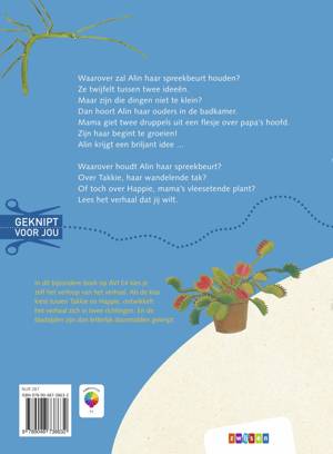 In dit bijzondere boek op AVI E4 kiest de lezer zelf de afloop van het verhaal. Het verhaal is letterlijk doormidden geknipt. Alin twijfelt waarover ze haar spreekbeurt zal houden. Ze heeft twee ideeën, maar zijn die dingen niet te klein voor in de klas? ’s Avonds hoort Alin haar ouders in de badkamer. Mama giet twee druppels uit een flesje over papa’s kale hoofd en … zijn haar begint te groeien! Dan krijgt Alin een briljant idee … Vanaf dit punt in het boek zijn de pagina’s doormidden geknipt en ontwikkelt het verhaal zich in twee richtingen. In het bovenste verhaal gaat Alins spreekbeurt over Takkie, haar wandelende tak. En in het onderste verhaal gaat haar spreekbeurt over mama’s vleesetende plant Happie. In beide gevallen voegt ze een klein beetje haargroeimiddel toe. Dat kan geen kwaad, toch? Welk verhaal je ook leest, dit boek is geknipt voor jou!