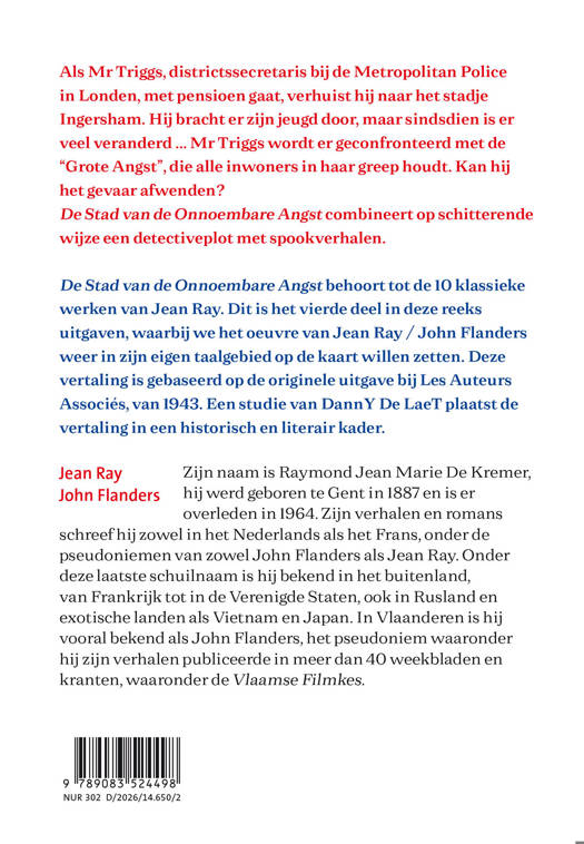 De Stad van de Onnoembare Angst behoort tot de 10 klassieke werken van Jean Ray. Dit is het vierde deel in deze reeks uitgaven, waarbij we het oeuvre van Jean Ray / John Flanders terug in zijn eigen taalgebied willen laten kennen. Deze vertaling is gebeurd vanaf de originele uitgave bij Les Auteurs Associés van 1943, en hier voorzien van een studie door DannY De LaeT die deze historisch en literair kadert.
