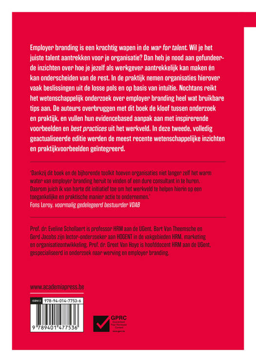 Employer branding is een krachtig wapen in de war for talent. Wil je het juiste talent aantrekken voor je organisatie? Dan heb je nood aan gefundeerde inzichten over hoe je jezelf als werkgever aantrekkelijk kan maken én kan onderscheiden van de rest. In de praktijk nemen organisaties hierover vaak beslissingen uit de losse pols en op basis van intuïtie. Nochtans reikt het wetenschappelijk onderzoek over employer branding heel wat bruikbare tips aan. De auteurs overbruggen met dit boek de kloof tussen onderzoek en praktijk, en vullen hun evidencebased aanpak aan met inspirerende voorbeelden en best practices uit het werkveld.