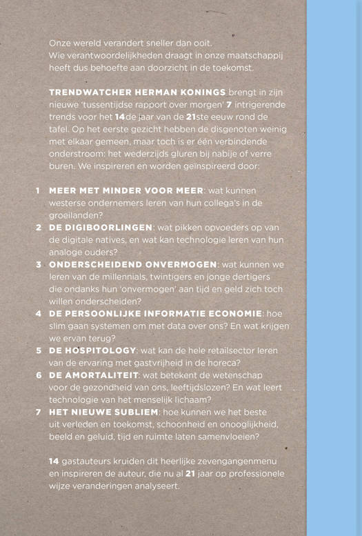 Mustread voor iedereen die in onzekere tijden geïnspireerd wil handelen Onze wereld verandert sneller dan ooit. Wie verantwoordelijkheden draagt in onze maatschappij heeft dus behoefte aan doorzicht in de toekomst. Trendwatcher Herman Konings brengt in zijn nieuwe 'tussentijdse rapport over morgen' 7 intrigerende trends voor het 14de jaar van de 21ste eeuw rond de tafel. Op het eerste gezicht hebben de disgenoten weinig met elkaar gemeen, maar toch is er één verbindende onderstroom: het wederzijds gluren bij nabije of verre buren. We inspireren en worden geïnspireerd door: 1 Meer met minder voor meer: wat kunnen westerse ondernemers leren van hun collega's in de groeilanden? 2 De digiboorlingen: wat pikken opvoeders op van de digitale natives, en wat kan technologie leren van hun analoge ouders? 3 Onderscheidend onvermogen: wat kunnen we leren van de millennials, twintigers en jonge dertigers die ondanks hun 'onvermogen' aan tijd en geld zich toch willen onderscheiden? 4 De persoonlijke informatie economie: hoe slim gaan systemen om met data over ons? En wat krijgen we ervan terug? 5 De hospitology: wat kan de hele retailsector leren van de ervaring met gastvrijheid in de horeca? 6 De amortaliteit: wat betekent de wetenschap voor de gezondheid van ons, leeftijdslozen? En wat leert technologie van het menselijk lichaam? 7 Het nieuwe subliem: hoe kunnen we het beste uit verleden en toekomst, schoonheid en onooglijkheid, beeld en geluid, tijd en ruimte laten samenvloeien? 14 gastauteurs kruiden dit heerlijke zevengangen-menu en inspireren de auteur, die nu al 21 jaar op professionele wijze veranderingen analyseert.