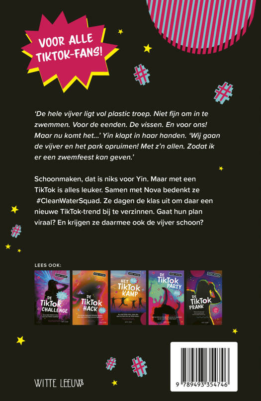 De TikTok Trend is een vlot fictie-avontuur met TikTok in de hoofdrol, van bestsellerauteur Annet Jacobs. Yin wil een zwemfeestje voor de klas organiseren. In de vijver in het park. Maar in het water drijft ontzettend veel troep. Is dat allemaal zwerfafval? Smerig! Tussen al die rommel wil natuurlijk niemand zwemmen. En het is ook nog eens gevaarlijk voor de eendjes en de vissen. Schoonmaken, dat is niet echt iets voor Yin. Maar met een TikTok is alles leuker. Samen met Nova bedenkt ze #CleanWaterSquad. Ze dagen de klas uit om daar een nieuwe TikTok-trend bij te verzinnen. Gaat hun plan viraal?