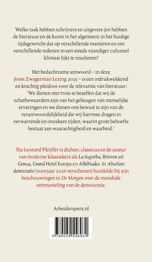 Het bedachtzame antwoord – in deze Joost Zwagerman Lezing 2025 – is een indrukwekkend en krachtig pleidooi voor de relevantie van literatuur: ‘We dienen met trots te beseffen dat wij de schatbewaarders zijn van het geheugen van menselijke ervaringen en we dienen ons bewust te zijn van de verantwoordelijkheid die wij hiermee dragen in verwarrende en onzekere tijden, waarin grote behoefte bestaat aan waarachtigheid en waarheid.’