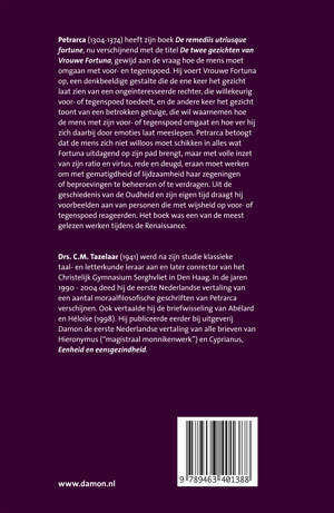 Petrarca (1304-1374) heeft zijn boek 'De remediis utriusque fortune', nu verschijnend met de titel 'De twee gezichten van Vrouwe Fortuna', gewijd aan de vraag hoe de mens moet omgaan met voor- en tegenspoed. Hij voert Vrouwe Fortuna op, een denkbeeldige gestalte die de ene keer het gezicht laat zien van een ongeïnteresseerde rechter, die willekeurig voor- of tegenspoed toedeelt, en de andere keer het gezicht toont van een betrokken getuige, die wil waarnemen hoe de mens met zijn voor- of tegenspoed omgaat en hoe ver hij zich daarbij door emoties laat meeslepen. Petrarca betoogt dat de mens zich niet willoos moet schikken in alles wat Fortuna uitdagend op zijn pad brengt, maar met volle inzet van zijn ratio en virtus, rede en deugd, eraan moet werken om met gematigdheid of lijdzaamheid haar zegeningen of beproevingen te beheersen of te verdragen. Uit de geschiedenis van de Oudheid en zijn eigen tijd draagt hij voorbeelden aan van personen die met wijsheid op voor- of tegenspoed reageerden. Het boek was een van de meest gelezen werken tijdens de Renaissance.