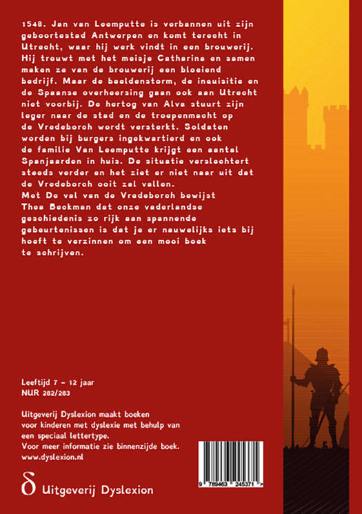 1548. Jan van Leemputte is verbannen uit zijn geboortestad Antwerpen en komt terecht in Utrecht, waar hij werk vindt in een brouwerij. Hij trouwt met het meisje Catharina en samen maken ze van de brouwerij een bloeiend bedrijf. Maar de beeldenstorm, de inquisitie en de Spaanse overheersing gaan ook aan Utrecht niet voorbij. De hertog van Alva stuurt zijn leger naar de stad en de troepenmacht op de Vredeborch wordt versterkt. Soldaten worden bij burgers ingekwartierd en ook de familie Van Leemputte krijgt een aantal Spanjaarden in huis. De situatie verslechtert steeds verder en het ziet er niet naar uit dat de Vredeborch ooit zal vallen. Met De val van de Vredeborch bewijst Thea Beckman dat onze vaderlandse geschiedenis zo rijk aan spannende gebeurtenissen is dat je er nauwelijks iets bij hoeft te verzinnen om een mooi boek te schrijven.