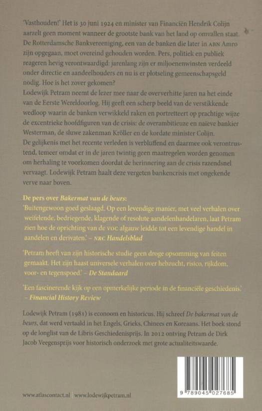 'Vasthouden!' Het is 30 juni 1924 en minister van Financiën Hendrik Colijn aarzelt geen moment wanneer de grootste bank van het land op omvallen staat. De Rotterdamsche Bankvereeniging, een van de banken die later in ABN Amro zijn opgegaan, moet overeind gehouden worden. Pers, politiek en publiek reageren hevig verontwaardigd: jarenlang zijn er miljoenenwinsten verdeeld onder directie en aandeelhouders en nu is er plotseling gemeenschapsgeld nodig. Hoe is het zover gekomen? Lodewijk Petram neemt de lezer mee naar de oververhitte jaren na het einde van de Eerste Wereldoorlog. Hij geeft een scherp beeld van de verstikkende wedloop waarin de banken verwikkeld raken en portretteert op prachtige wijze de excentrieke hoofdfiguren van de crisis: de overambitieuze en naïeve bankier Westerman, de sluwe zakenman Kröller en de kordate minister Colijn. De gelijkenis met het recente verleden is verbluffend en daarmee ook verontrustend, temeer omdat er in de jaren twintig geen maatregelen worden genomen om herhaling te voorkomen doordat de herinnering aan de crisis razendsnel vervaagt. Lodewijk Petram haalt deze vergeten bankencrisis met ongekende verve naar boven.