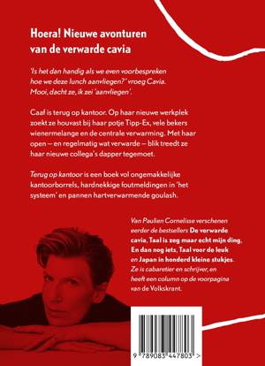 Terug op kantoor is een grappig en ontroerend boek. De kantooravonturen van Cavia zijn een feest der herkenning voor iedereen die ooit op een kantoor heeft gewerkt, al was het maar een vakantiebaantje. Van ongemakkelijke kantoorborrels en hardnekkige foutmeldingen in ‘het systeem’ tot wiener melanges en een pijnlijke ontslagronde.